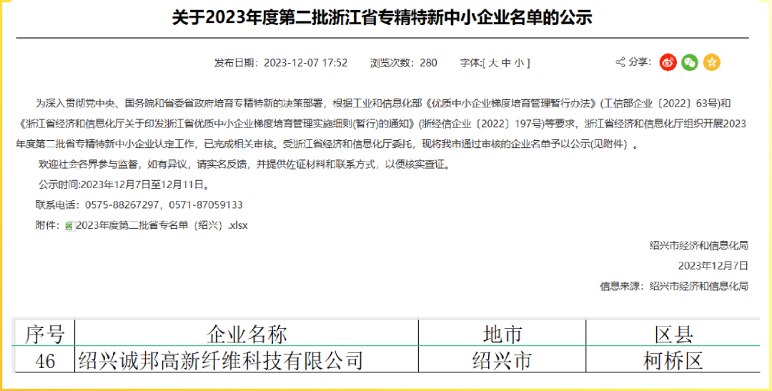 ? ? ? 12月7日,紹興市經(jīng)信局公示的2023年度第二批浙江省“專精特新”中小企業(yè)名單中,集團(tuán)旗下誠(chéng)邦高新纖維科技有限公司榮膺其中。“專精特新”是指企業(yè)在行業(yè)領(lǐng)域內(nèi)更具有專業(yè)性、精細(xì)化、特色化、新穎化。