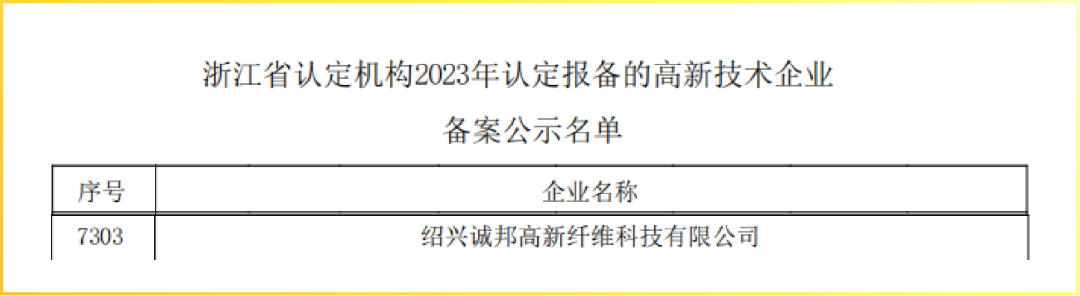 ? ? ? ?在12月8日,誠(chéng)邦高新又被列入浙江省認(rèn)定機(jī)構(gòu)2023年認(rèn)定報(bào)備的高新技術(shù)企業(yè)名單。“高新技術(shù)企業(yè)認(rèn)定”是國(guó)家調(diào)整產(chǎn)業(yè)結(jié)構(gòu)、提升產(chǎn)業(yè)競(jìng)爭(zhēng)力的關(guān)鍵舉措,企業(yè)要滿足包括核心技術(shù)、研發(fā)能力、成果轉(zhuǎn)化以及經(jīng)營(yíng)業(yè)績(jī)等一系列的嚴(yán)格指標(biāo)和標(biāo)準(zhǔn)。
