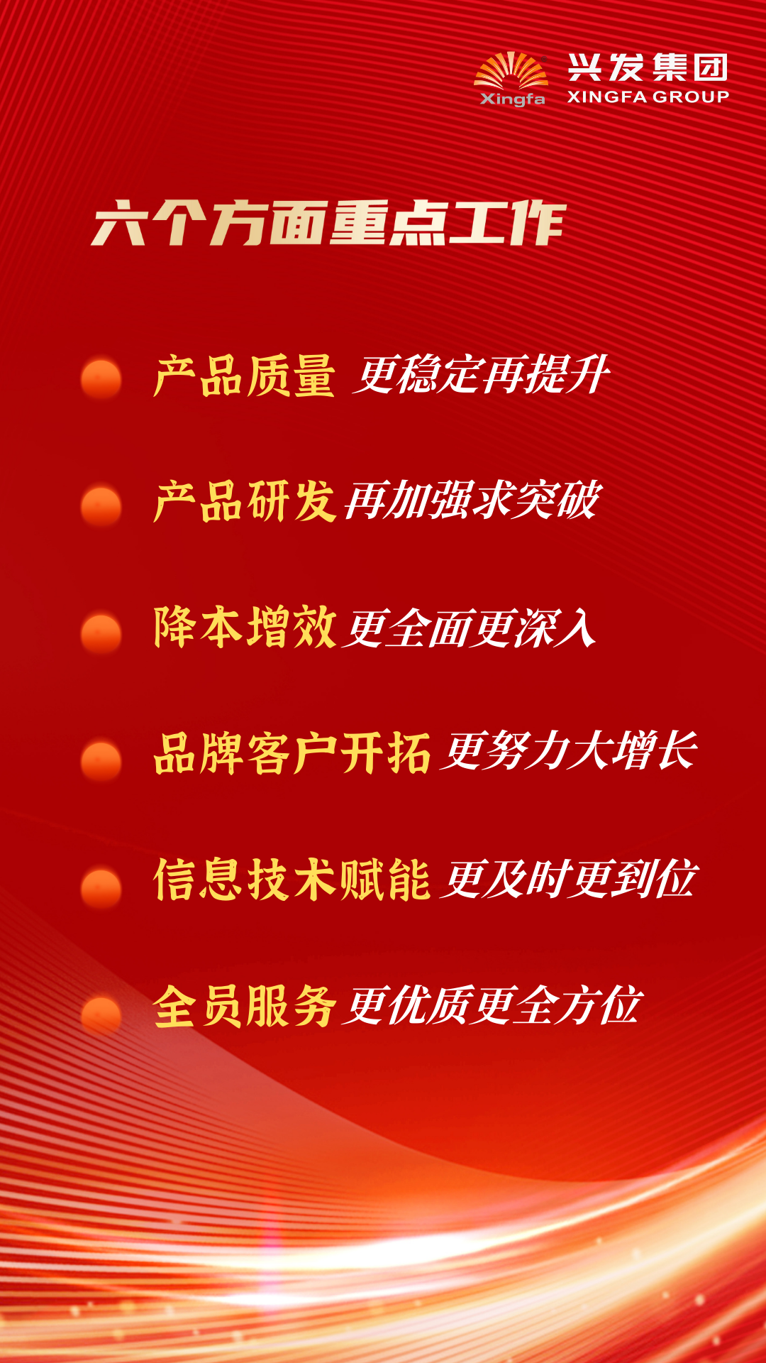 2025年,正值興發(fā)成立三十年,也是興發(fā)邁向今后三十年新征程新階段的交替之年,讓我們堅定信心,圍繞集團工作基本思路,抓住重點工作,以 “更大決心、更大力度、更多辦法”,按照“品質(zhì)做到極致、成本降到極致、服務(wù)做到極致”的方向,真正落實到平時日常具體工作中去。相信全體興發(fā)人一定能凝心聚力、協(xié)同作戰(zhàn)、克難攻堅,實現(xiàn)公司的宏大愿景,每位員工也將在這個過程中收獲更多成功與幸福。